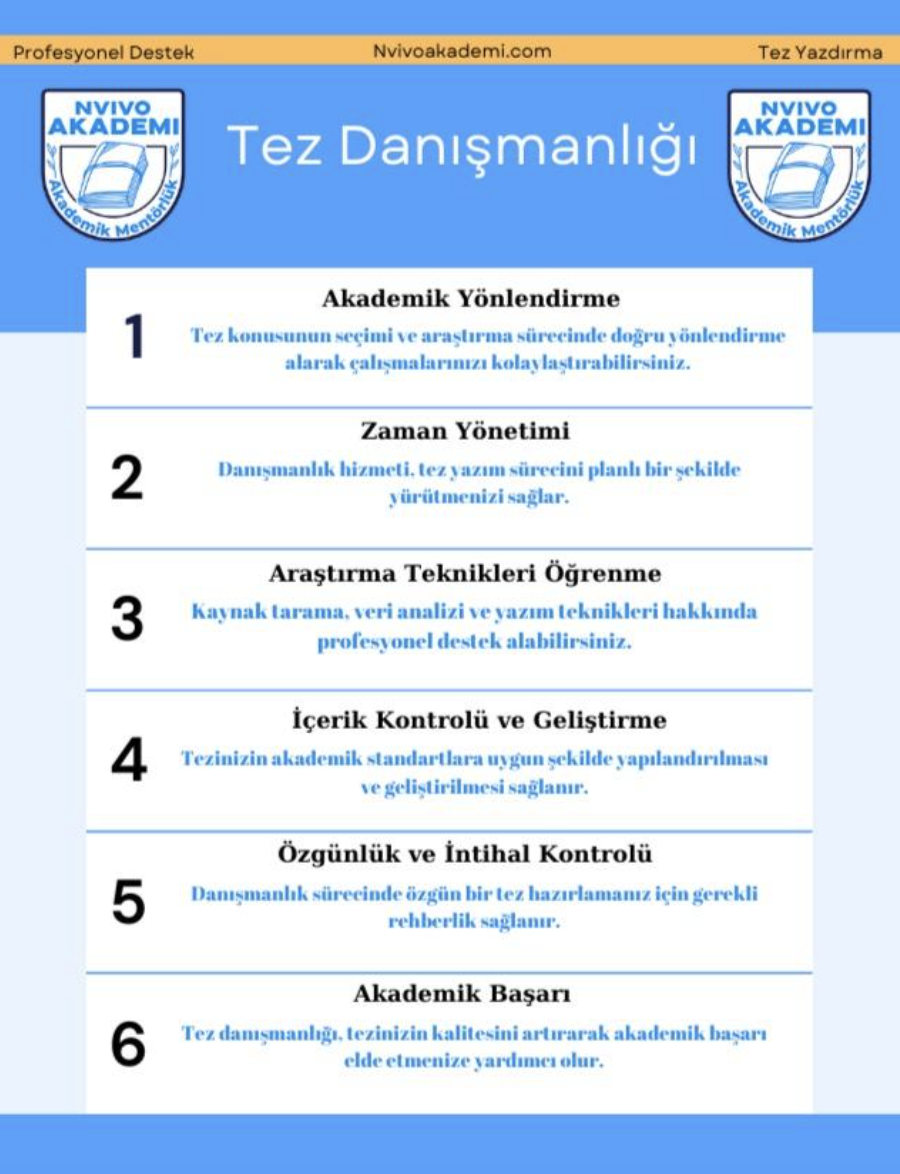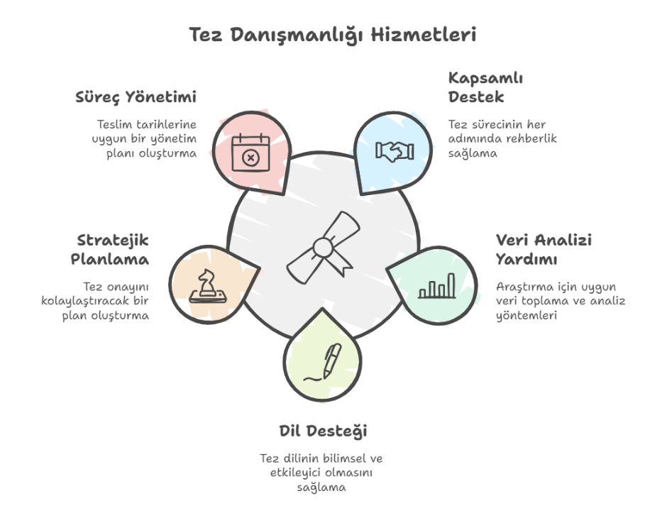 Tez yazma sürecinde, akademik destek olarak tez danışmanlığı verilir. Konu seçimi, veri analizi, kaynak tarama ve yazım kuralları bu hizmetin kapsamındadır. Çok sayıda öğrenci, zorlu ve zaman alan tez yazma süreci nedeniyle profesyonellerden yardım almayı tercih eder.